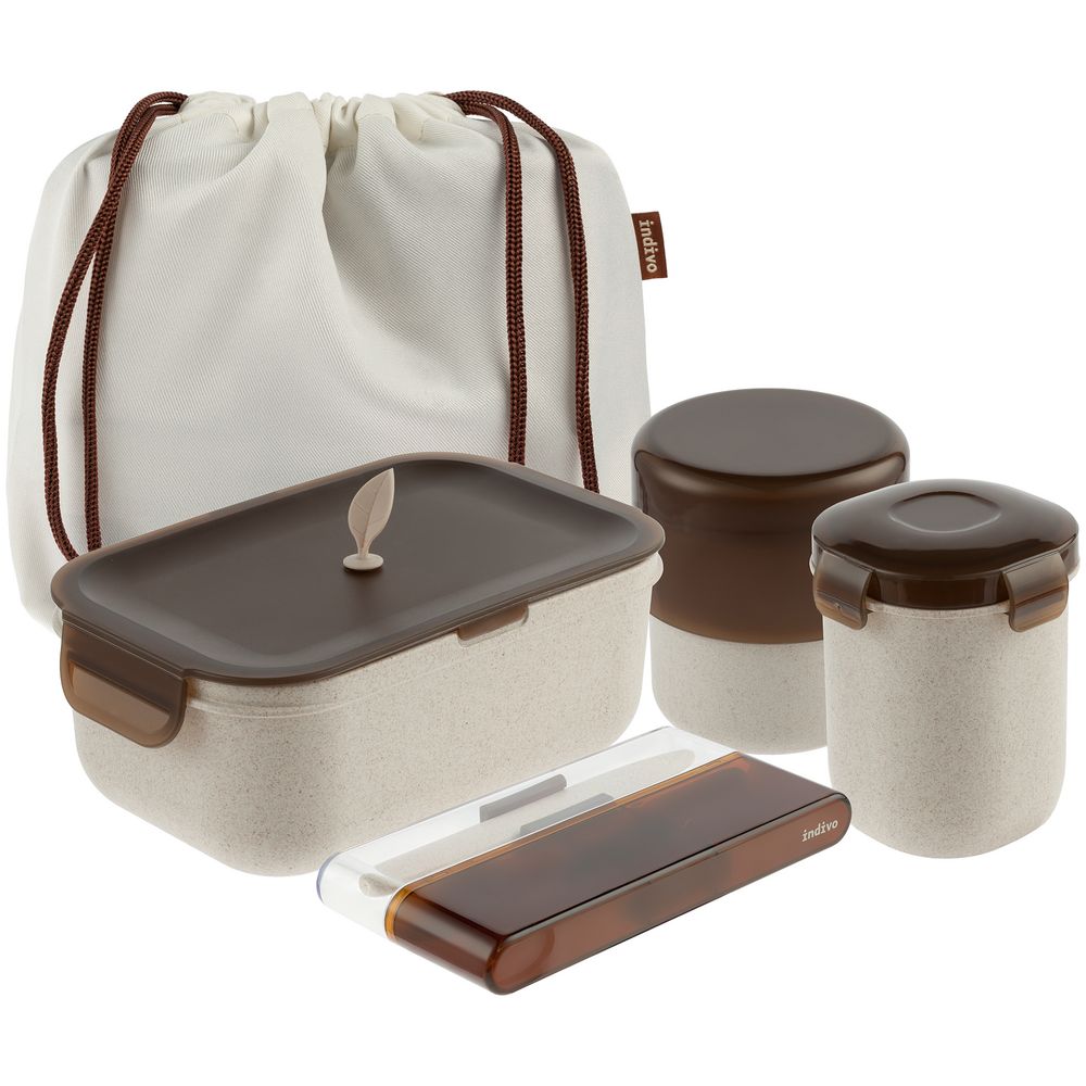Материал: ланчбоксы, приборы - растительные волокна; мешок - пластик, полиэстер; пластик, полипропилен