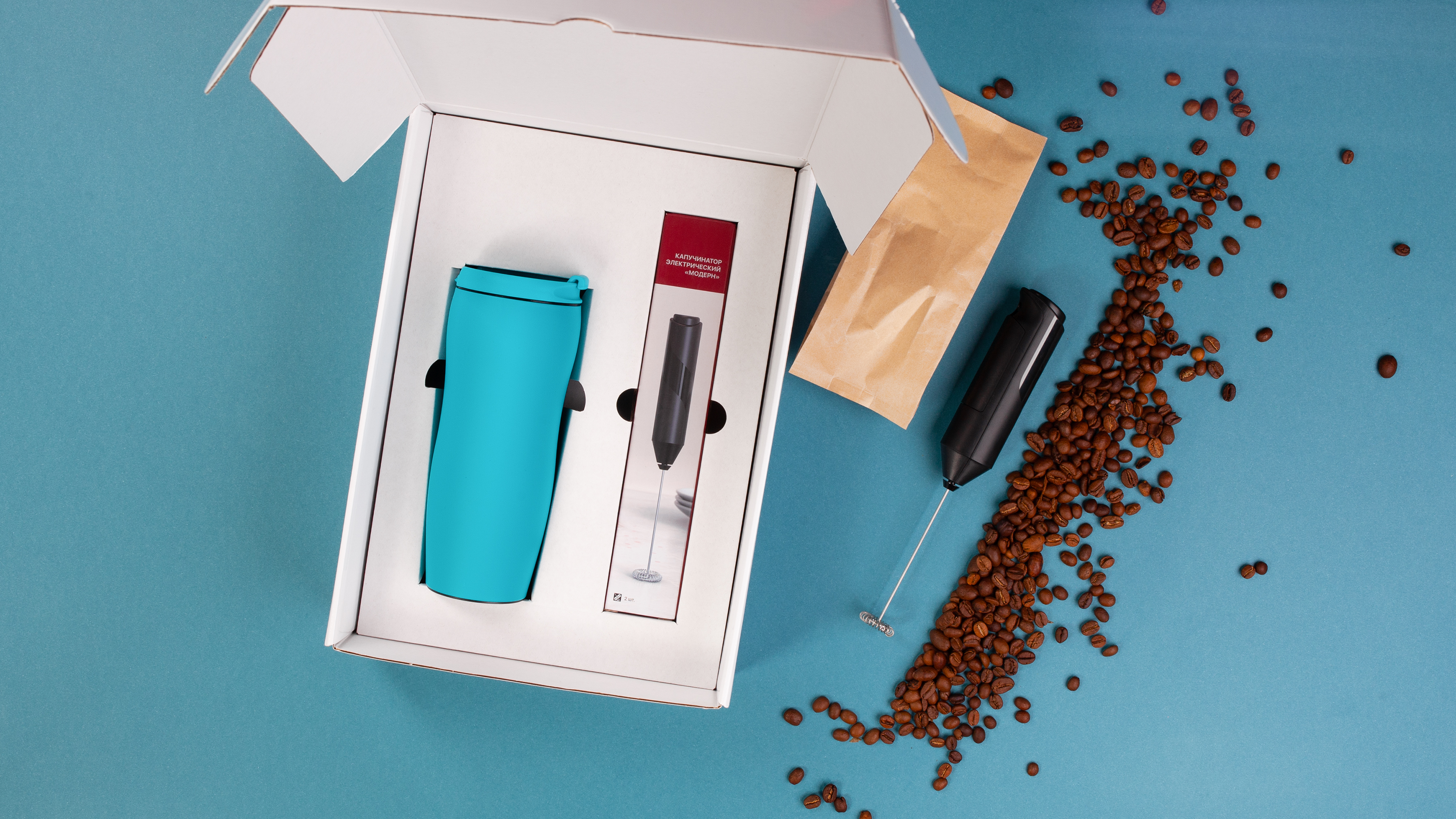 Набор, который станет приятным подарком для всех любителей кофе: зерновой кофе, термостакан и капучинатор для молока, чтобы ваш напиток получился с пенкой!