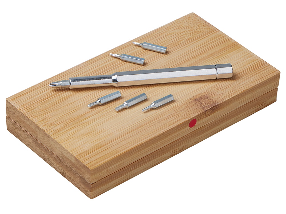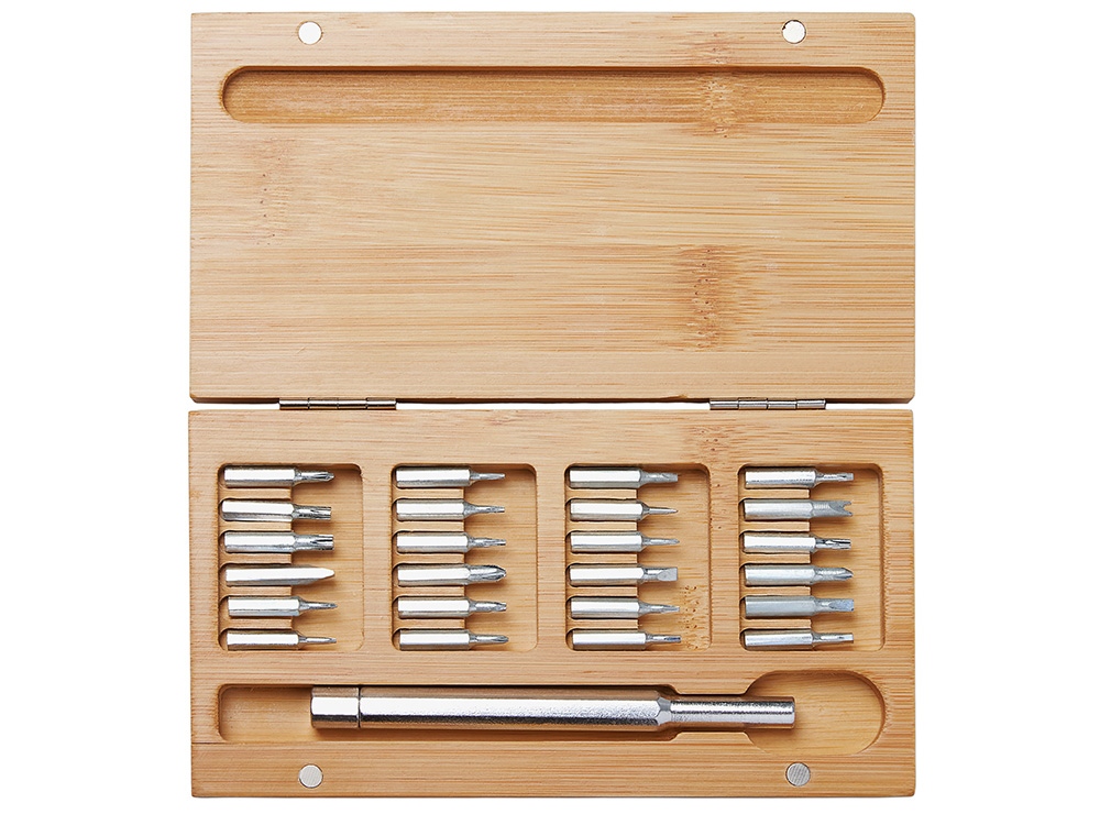 Стильный и практичный набор отверток в элегантном корпусе из натурального бамбука. Компактный кейс закрывается на магниты, а верхняя крышка отмечена круглым красным стикером для удобной идентификации. Внутри — отвертка и 24 наиболее востребованные биты: крестовые, плоские и звездочки, которые подойдут для решения большинства бытовых и профессиональных задач. Набор выполнен из экологичных материалов — прочной стали и натурального бамбука. Классическая прямоугольная форма без выступающих деталей делает его особенно удобным для персонализации и нанесения логотипа.