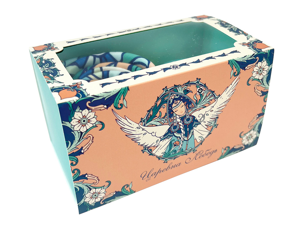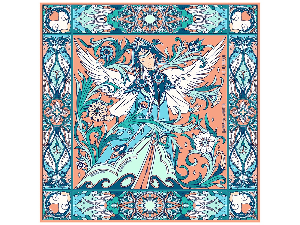 Платок Царевна Лебедь создан по мотивам сказочно-фольклорного мира А.С. Пушкина, где прекрасная Царевна воплощает добродетель, мудрость и чарующую красоту. Перевоплощаясь в птицу, она способна достичь небывалых высот и озарить мир своим великолепием.