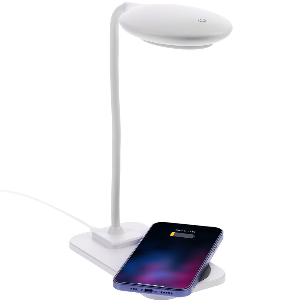 Настольная лампа с беспроводной зарядкой Modicum, белая с логотипом компании - отличный способ заявить вашу корпоративную идентичность.