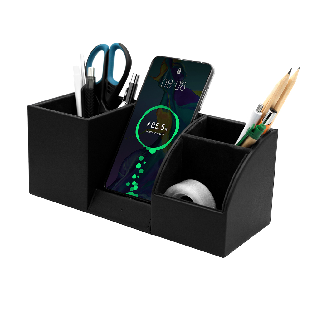 Настольный органайзер Boss c беспроводной зарядкой и световым индикатором. Для работы или дома, сочетающий в себе подставку для канцелярских принадлежностей и мелких аксессуаров. Вход: 9V/1.67A/5V/2A USB 2.0. Выход: Беспроводная зарядка 10W. В комплекте кабель USB и инструкция.