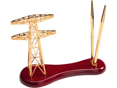 Настольный набор состоит из двух ручек золотистого цвета, размещенных на подставке, и фигурки высоковольтного столба ЛЭП. Такой тематический подарок отлично подойдет для руководителей или сотрудников энергетических компаний и станет оригинальным украшением рабочего стола.