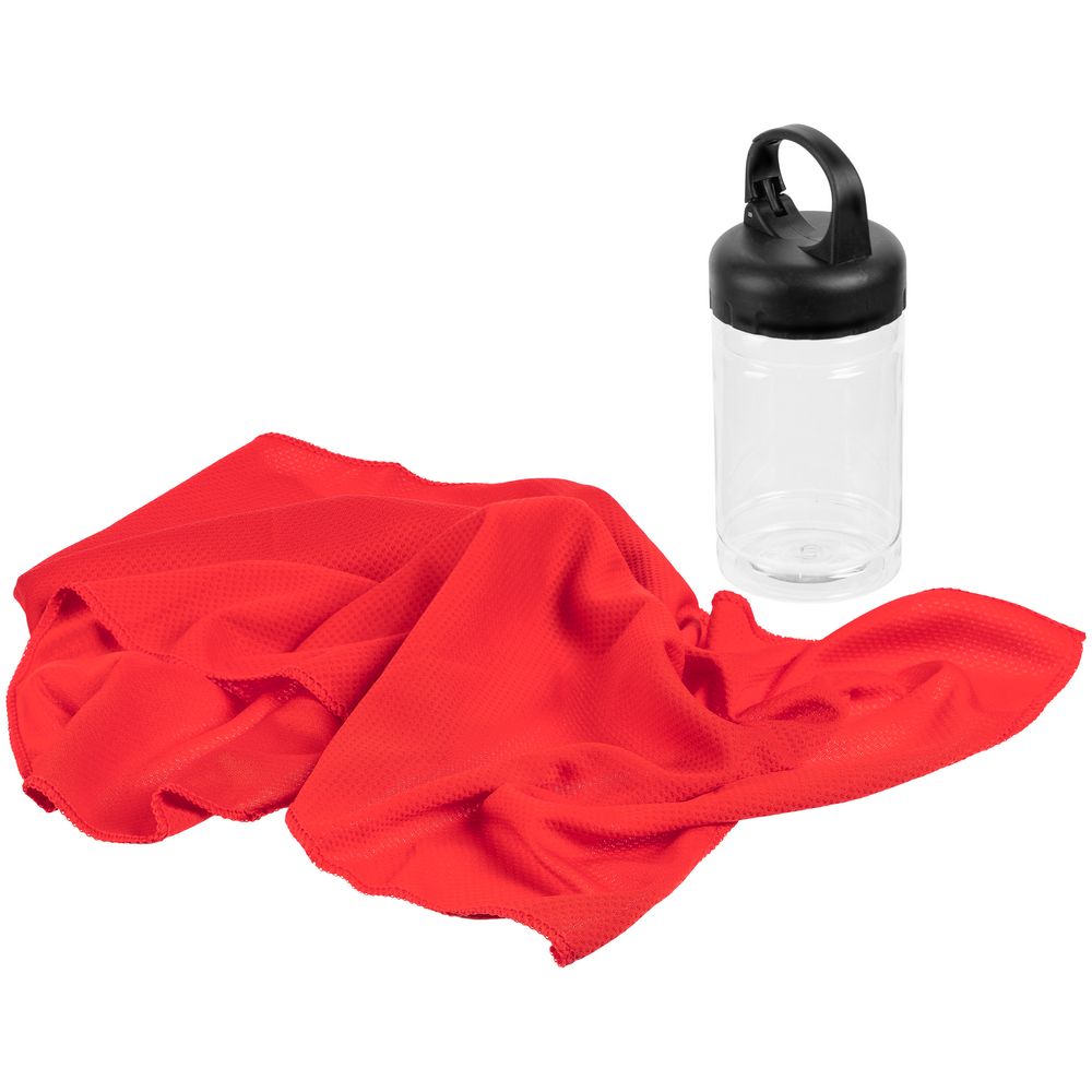 Охлаждающее полотенце Frio Mio в бутылке, красное с логотипом компании - отличный способ заявить вашу корпоративную идентичность.