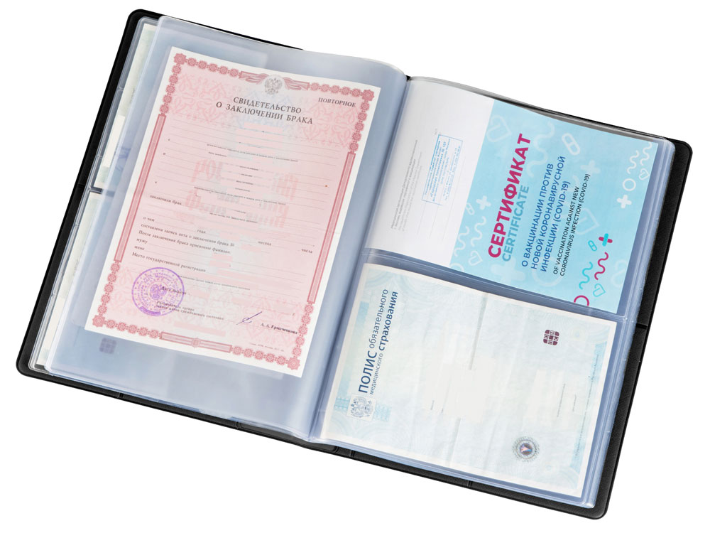 С ним свидетельства о рождении, браке и др. важные документы будут рассортированы и доступны для просмотра, будучи помещенными в прозрачные кармашки из пленки ПВХ.