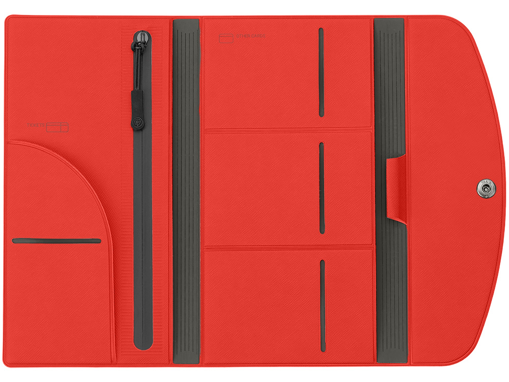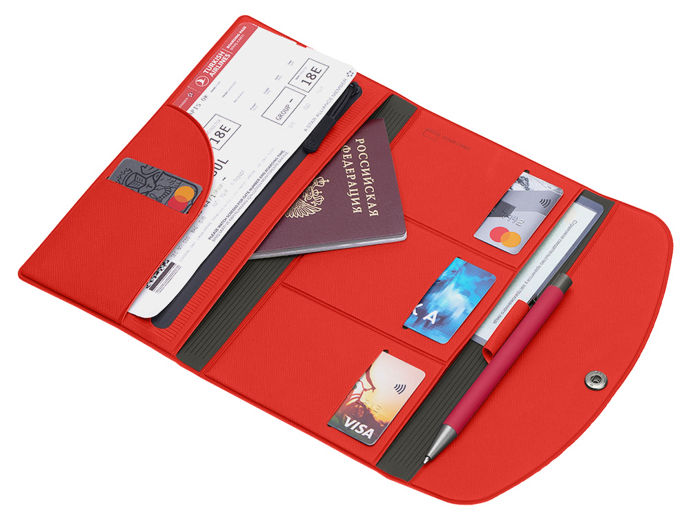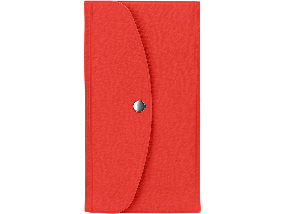 Главная ->Корпоративные подарки и рекламные сувениры на складе -> Бизнес-подарки -> Бумажники -> Органайзер для документов на кнопке с отделением для купюр и ручки, упаковка в индивидуальный пакет, красный/серый
