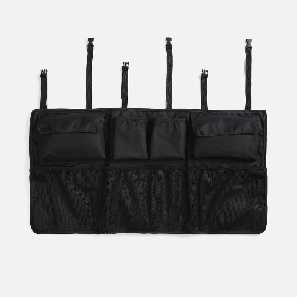 В органайзере имеются разные по форме и типу карманы: карманы-сетки, карманы с крышкой на липучке и открытые карманы. Конструкция крепится ремнями за подголовники задних сидений. Дополнительно на его задней части имеются ленты-липучки, которые обеспечивают полное прилегание к спинкам задних кресел.