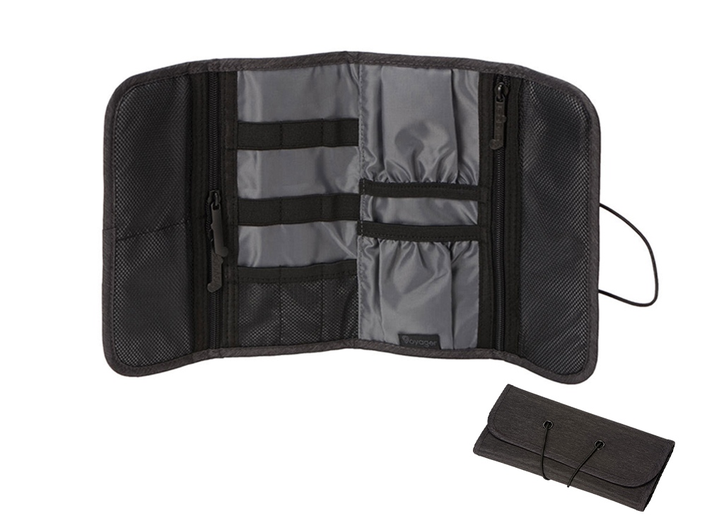 Органайзер District для электроники Voyager с множеством кармашков и отделений позволяет рассортировать девайсы, провода и другие аксессуары для техники удобным вам способом. Органайзер имеет 6 сетчатых кармашков, из них три на молнии, с бегунками, украшенными логотипом бренда. Кроме того, он имеет держатели для проводов и открытые карманы на резинке. Обложка закрывается на резинку, которая зацепляется за круглую пуговицу, и в сложенном виде органайзер весьма компактен, несмотря на свою вместительность. Благодаря форме его можно набить достаточно туго, ведь растягивающаяся резинка на обложке позволяет варьировать степень наполненности органайзера.