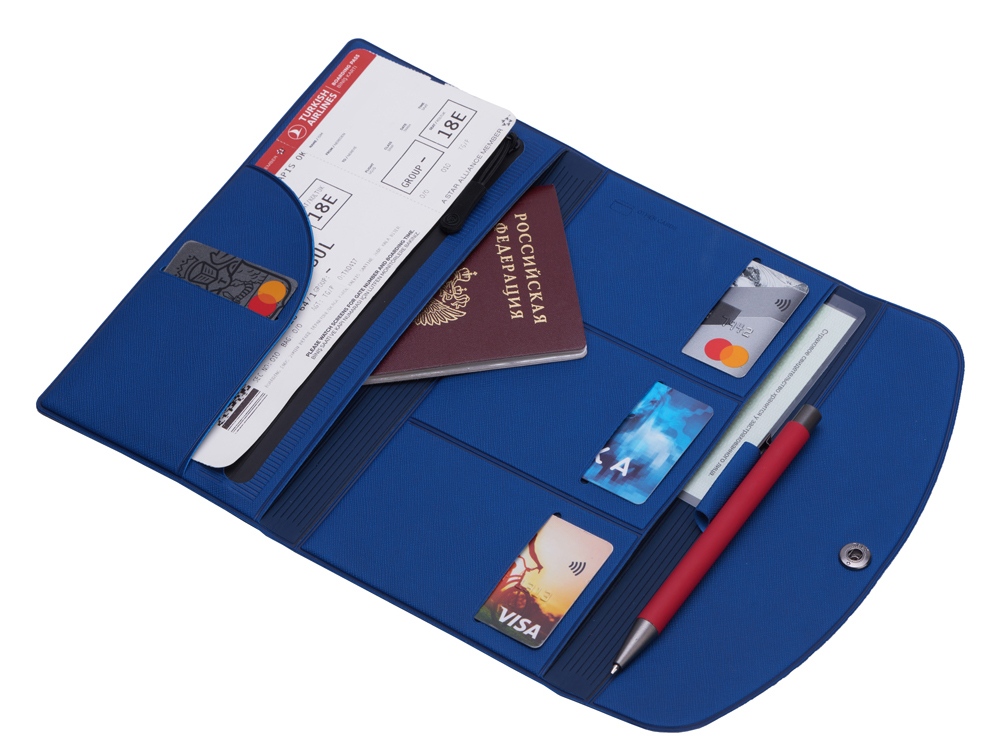 Органайзер для документов на кнопке с отделением для купюр и ручки, упаковка в индивидуальный пакет, синий/темно-синий