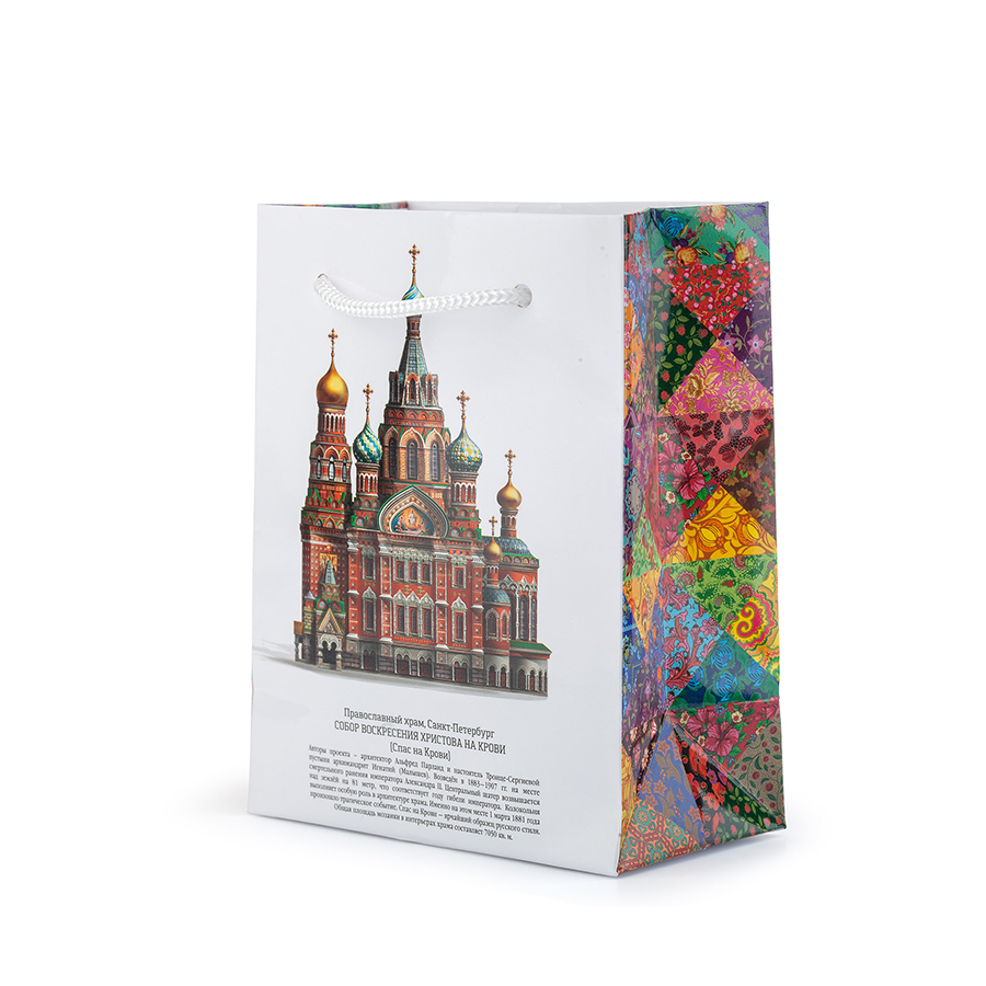 Подарочный прочный ламинированный пакет с люверсами и плетёными верёвочными ручками из толстого шнура. Пакет снабжён авторской иллюстрацией и описанием истории собора Спаса на Крови на русском и английском языках и в этом смысле не имеет аналогов. Боковины пакета декорированы эффектным узором в стиле пэчворк, напоминающим лоскутное одеяло.