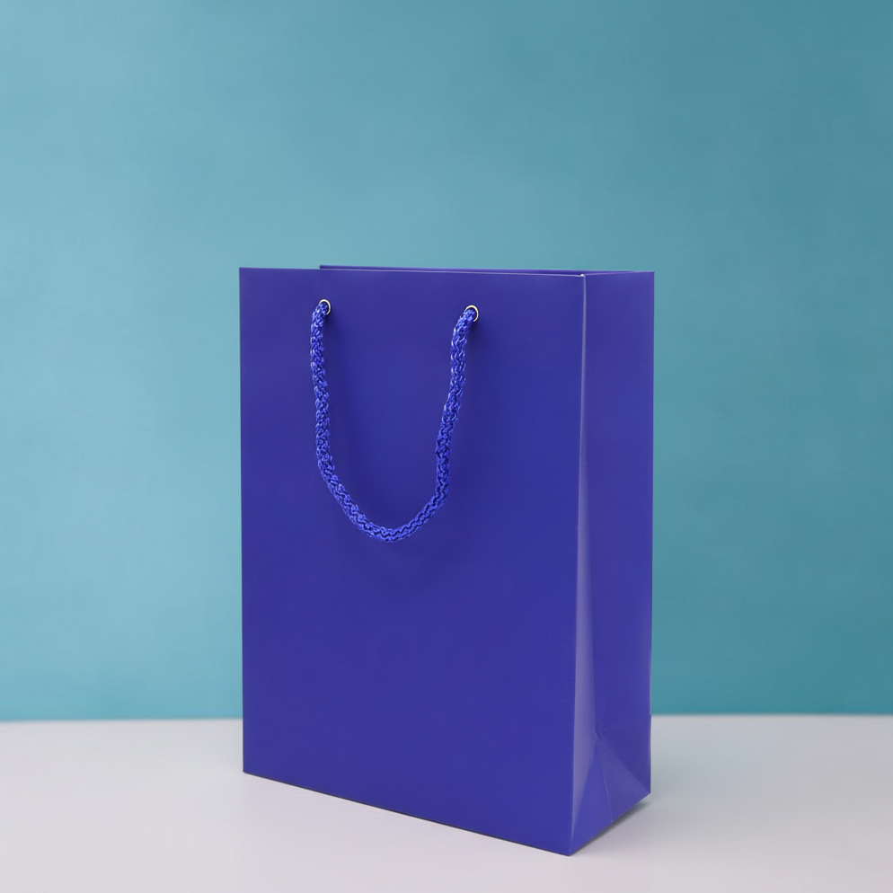 Бумажный пакет плотностью 170 г/м?. Покрытие софт-тач. Шнур 6 мм синего цвета. Люверс - серебристый.