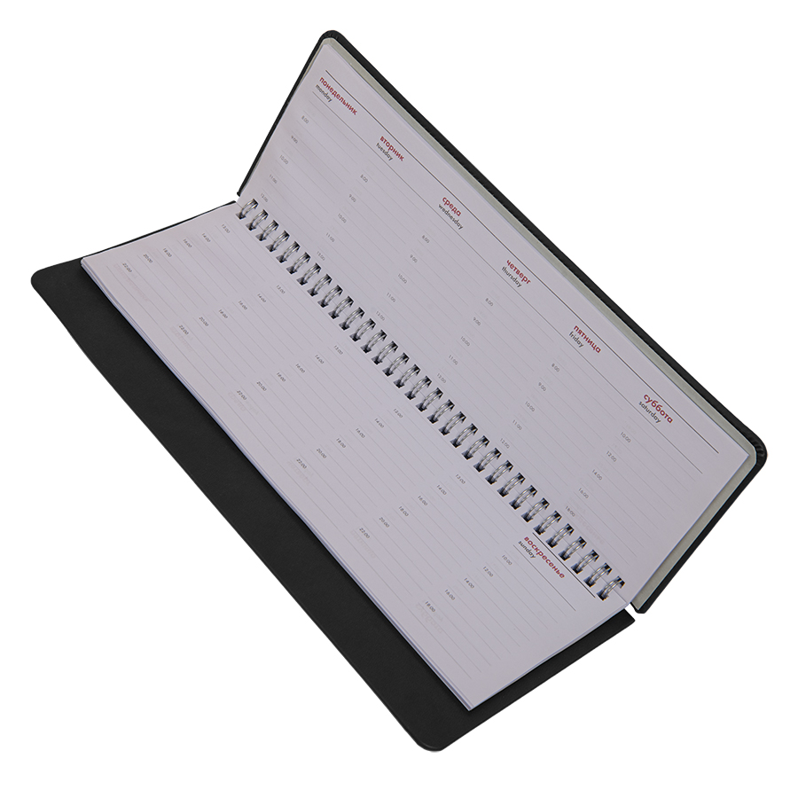 Переплет твердый, на металлической спирали, прошивка по периметру верхней обложки