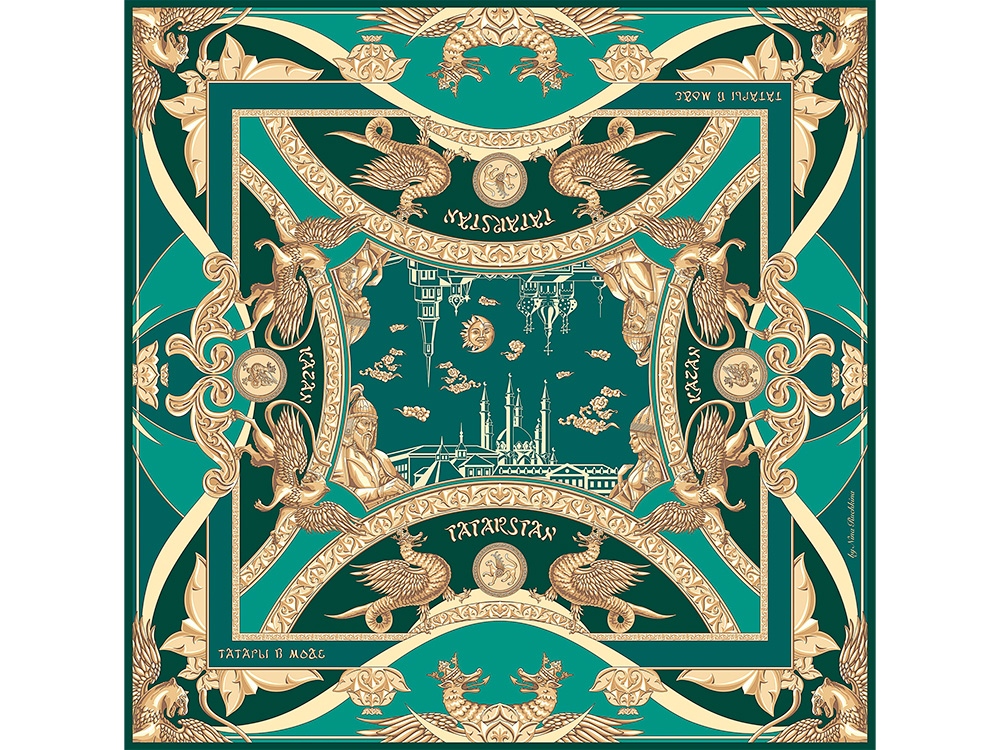 Крылатый барс как — Бог плодородия и покровитель детей, изображение которого присутствует на государственном гербе Республики Татарстан идеально вписывается в общую композицию. На платке барс изображен в виде золотой скульптуры, как и Зилант, это придает платку сказочности, волшебства и царственности.
