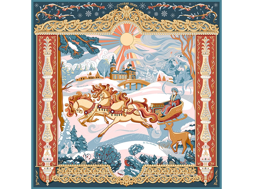 Платок Русская зима воплощает фольклорный образ красавицы-зимы.