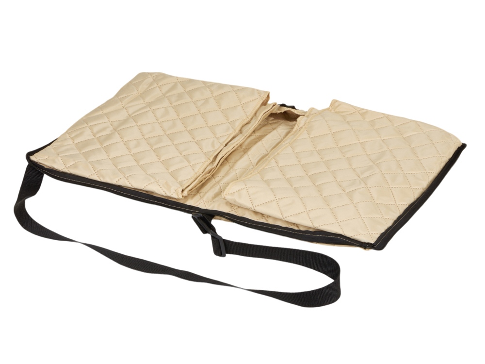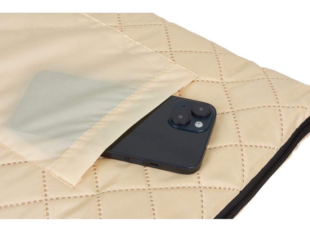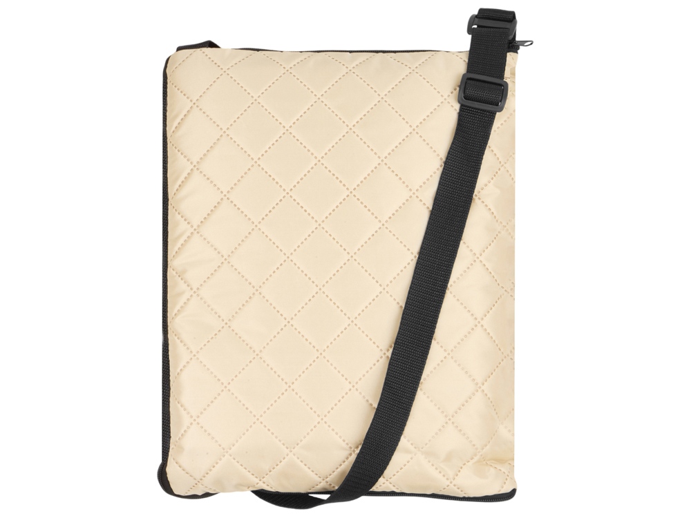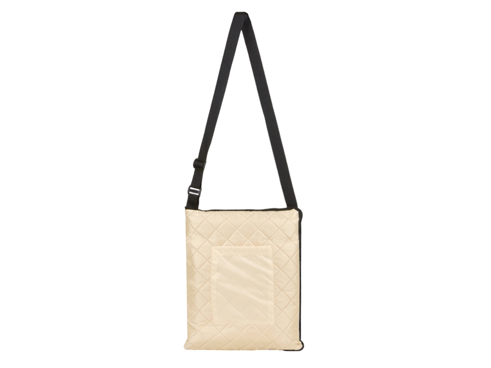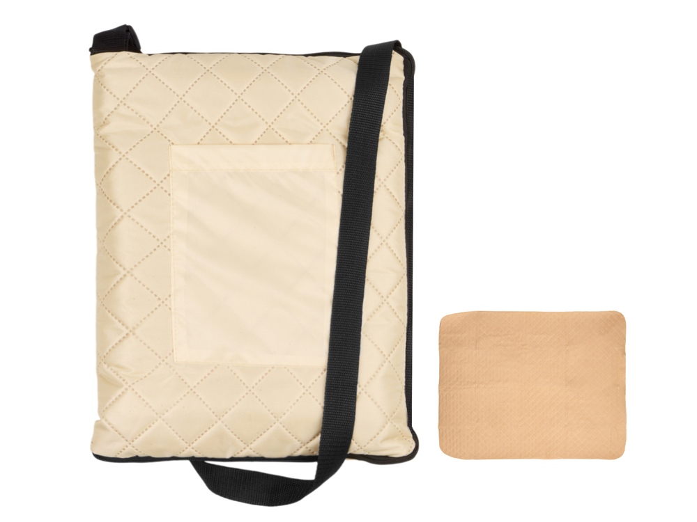 Двухсторонний плед с водоотталкивающим покрытием с одной стороны и мягким флисом с другой. Складывается в сумку на плечо и фиксируется с помощью молнии. В собранном виде имеет регулируемый по длине ремень для переноски и наружный карман для мелочей.
