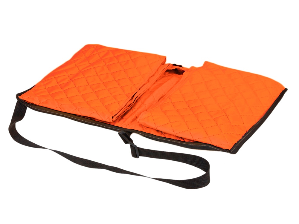 Двухсторонний плед с водоотталкивающим покрытием с одной стороны и мягким флисом с другой. Складывается в сумку на плечо и фиксируется с помощью молнии. В собранном виде имеет регулируемый по длине ремень для переноски и наружный карман для мелочей.