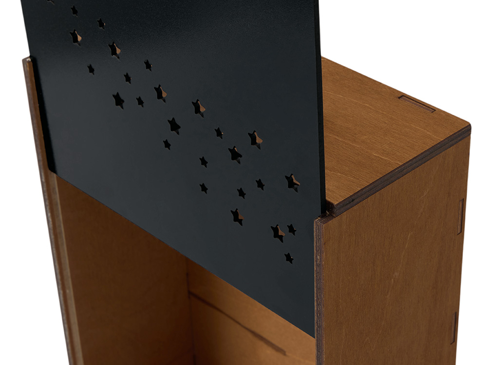 Главная ->Корпоративные подарки и рекламные сувениры на складе -> Подарочные упаковки -> Подарочная упаковка -> Подарочная коробка из фанеры Constellation 330х220х100 мм, фанера 6 мм, крышка на выдвижных пазах черная ЛХДФ 3 мм, бечевка