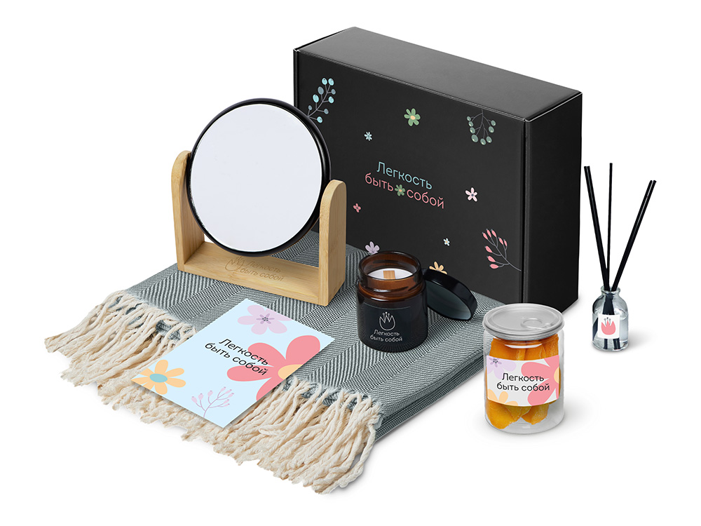 Подарочный набор Re:f. Shelter с пледом, зеркалом, свечой и диффузором с логотипом компании - отличный способ заявить вашу корпоративную идентичность.