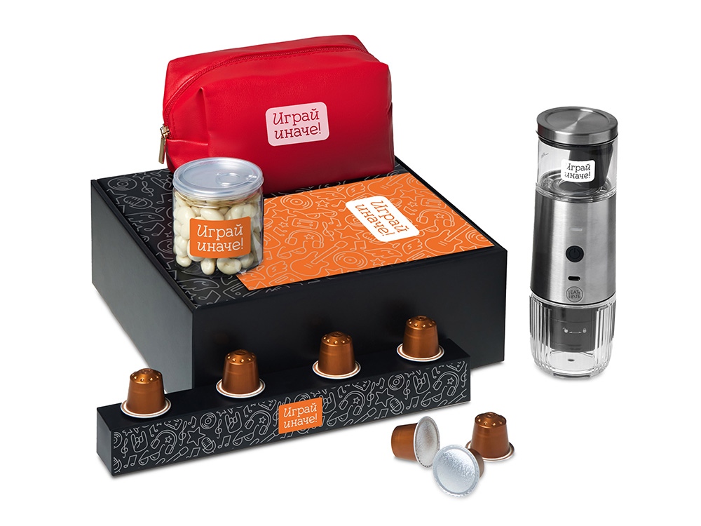 Подарочный набор Re:y. Boost с кофемашиной, капсулами и косметичкой с логотипом компании - отличный способ заявить вашу корпоративную идентичность.