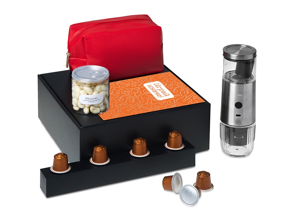 Набор Re:y. Boost о бодрости, энергии и маленьких ритуалах, которые можно взять с собой. Портативная кофемашина и кофе в капсулах позволяют приготовить ароматный напиток дома, в офисе или на прогулке. Кешью в глазури добавляет сладкую нотку, а косметичка позволяет взять любимые вещи с собой, куда бы вы ни отправились.. Этот набор превращает привычный утренний ритуал в момент бодрости и комфорта, где бы вы ни были.