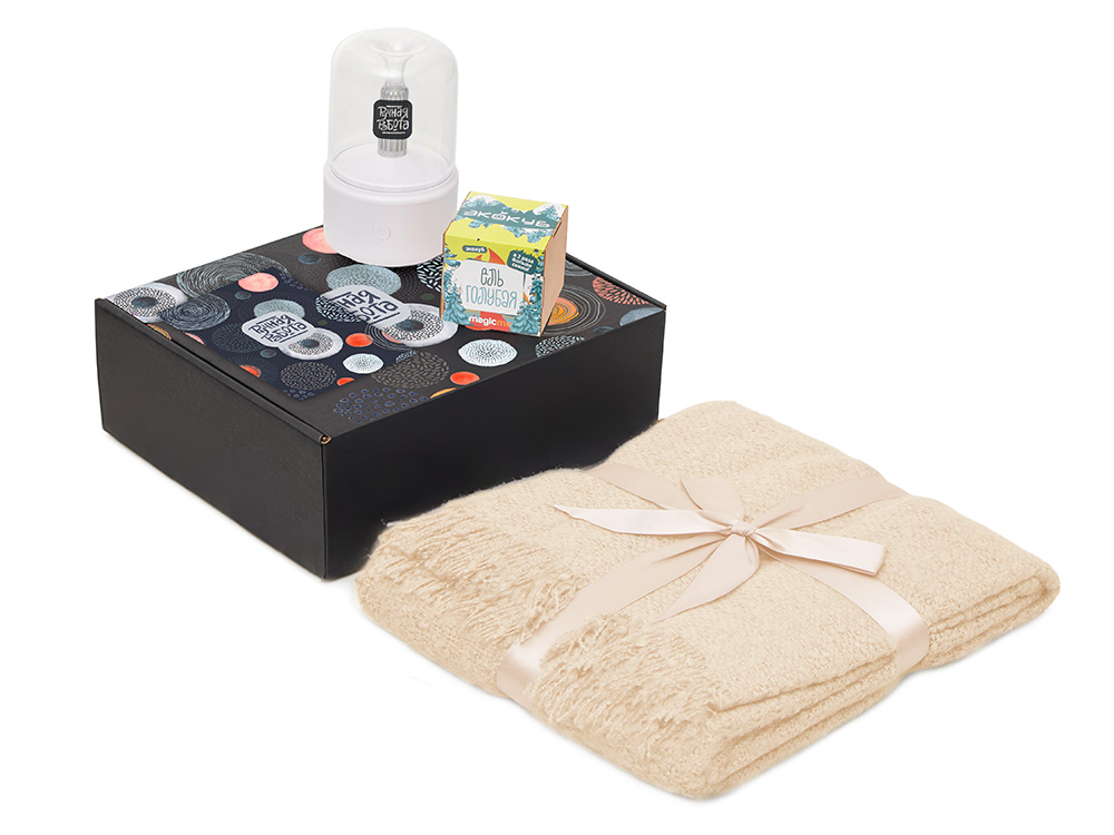 Материал: плед - 100% акрил, увлажнитель-аромадиффузор - АБС палстик, поликарбонат, набор для выращивания - дерево, мешок - нетканый материал (спанбонд), коробка - картон