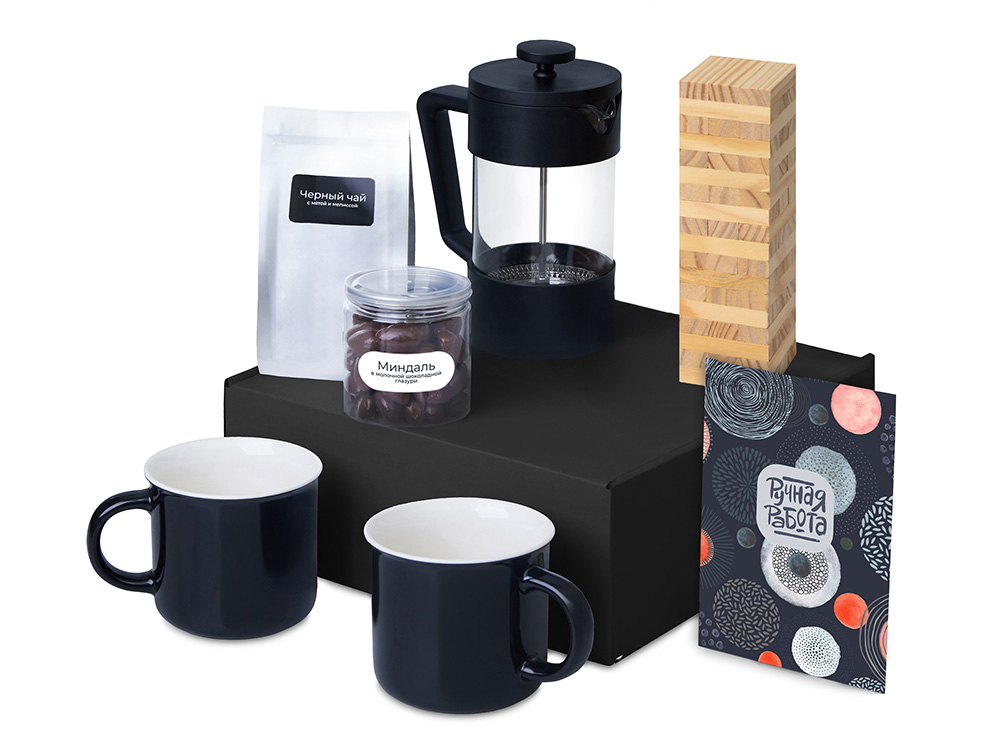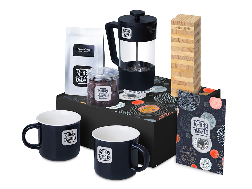 Подарочный набор Re:y. Together с френчпрессом, кружками и дженгой с логотипом компании - отличный способ заявить вашу корпоративную идентичность.