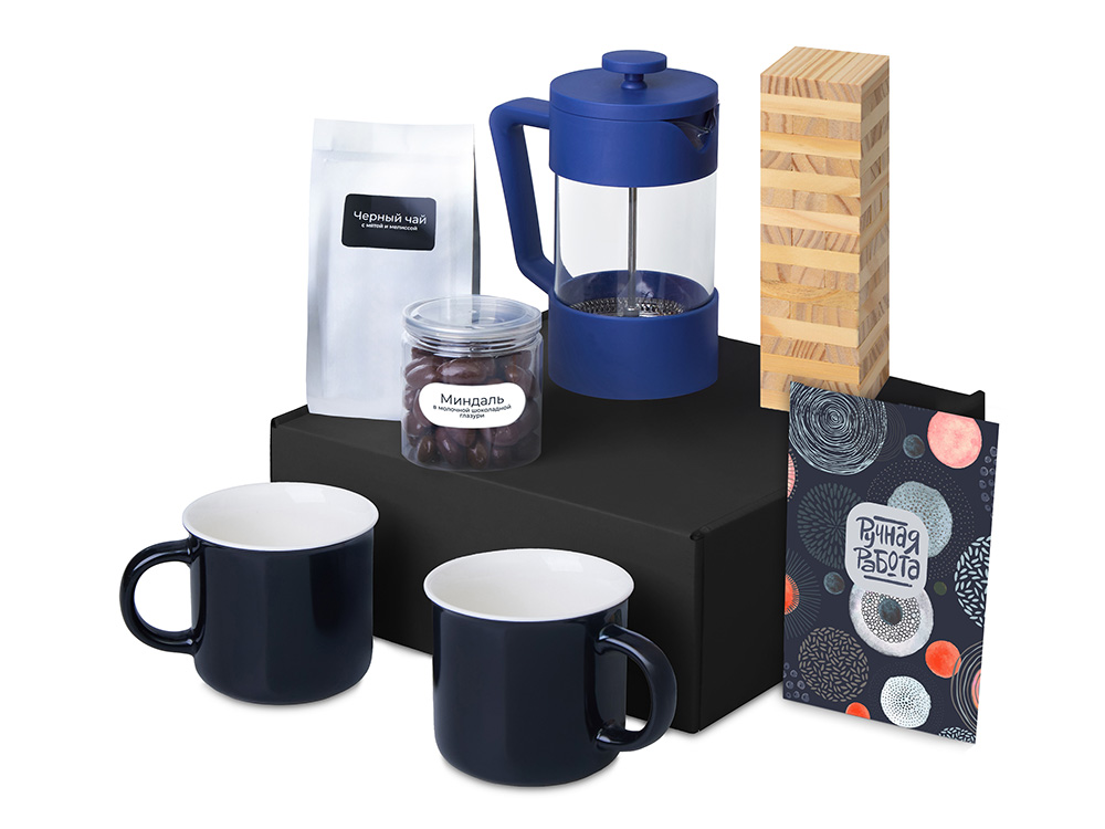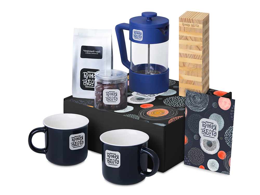 Подарочный набор Re:y. Together с френчпрессом, кружками и дженгой с логотипом компании - отличный способ заявить вашу корпоративную идентичность.