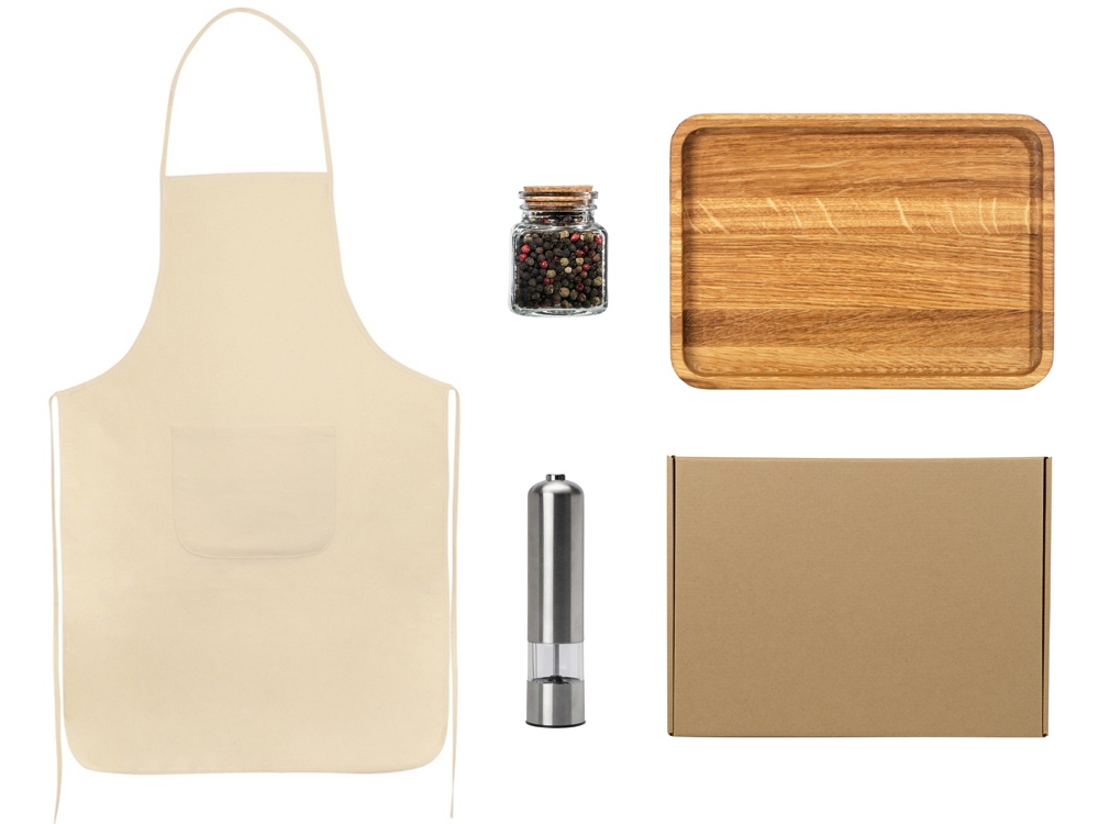 Подарочный набор для кухни с фартуком, подносом, мельницей и специями с логотипом компании - отличный способ заявить вашу корпоративную идентичность.