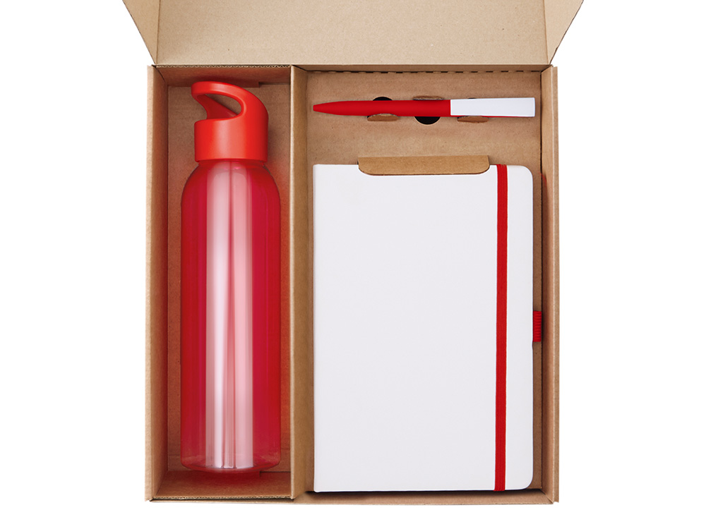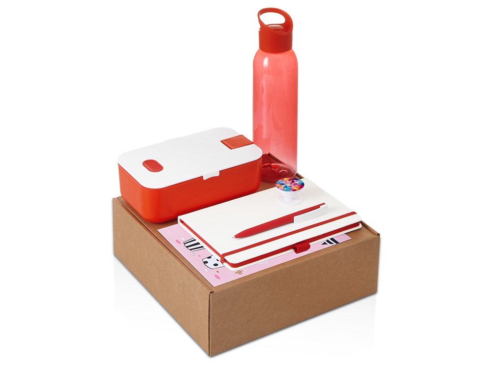 Подарочный набор с бутылкой для воды. блокнотом, ручкой и ланчбоксом, красный с логотипом компании - отличный способ заявить вашу корпоративную идентичность.