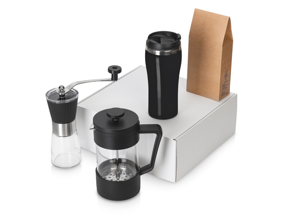 Главная ->Корпоративные подарки и рекламные сувениры на складе -> Термос и бутылка -> Термосы -> Подарочный набор с кофе, кружкой и френч-прессом Бодрое утро 2.0, черный