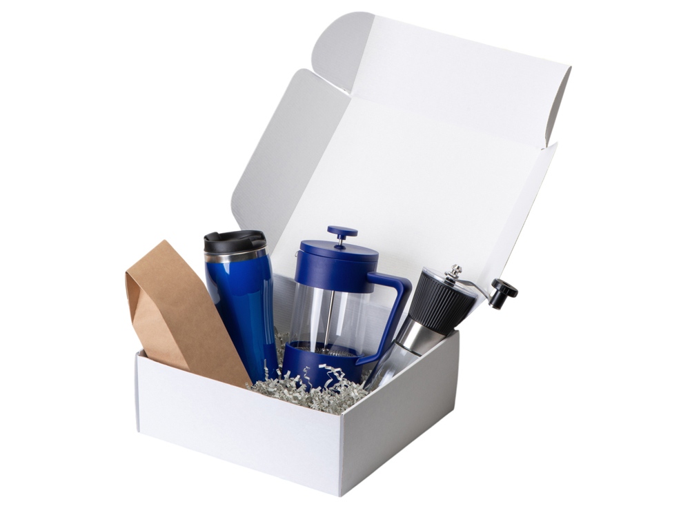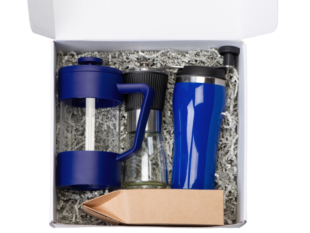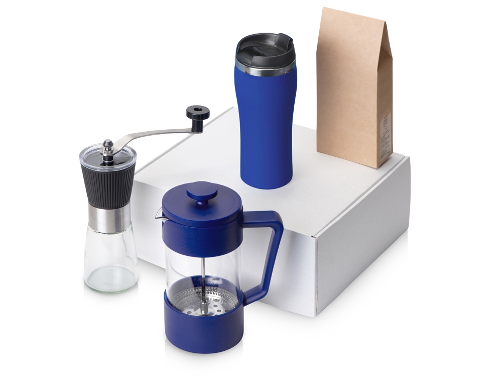 Главная ->Корпоративные подарки и рекламные сувениры на складе -> Термос и бутылка -> Термосы -> Подарочный набор с кофе, кружкой и френч-прессом Бодрое утро 2.0, синий