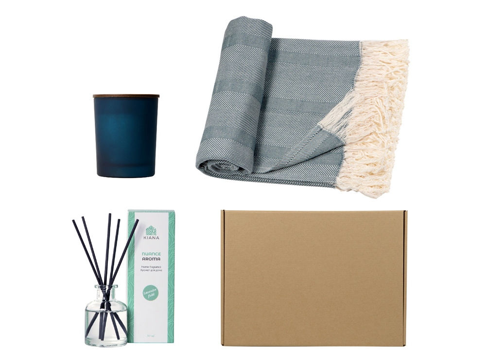 Подарочный набор с пледом, свечой и диффузором, синий с логотипом компании - отличный способ заявить вашу корпоративную идентичность.