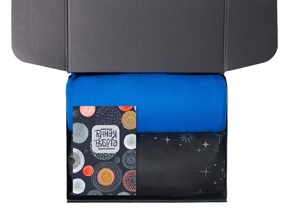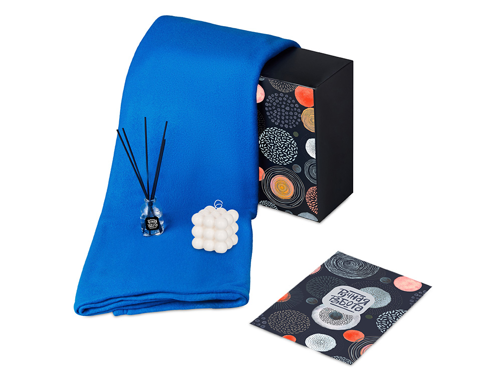 Компания «Эклектика BY» осуществляет нанесение логотипа на сувенирную продукцию: Подарочный набор с пледом, свечой и диффузором, синий. Арт. 458468