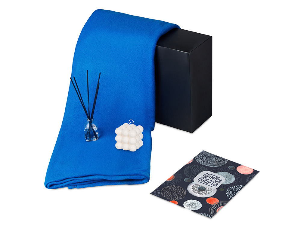 Подарочный набор с пледом, свечой и диффузором, синий с логотипом компании - отличный способ заявить вашу корпоративную идентичность.