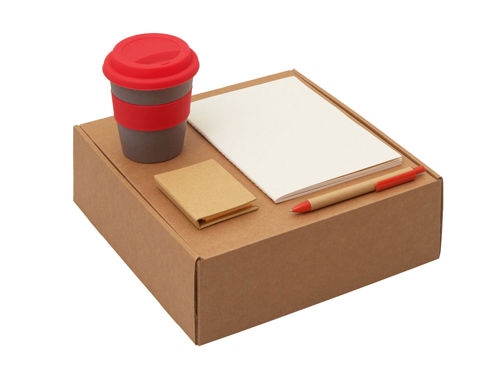 Материал: блокнот- бумага из переработанных тетра-паков, ручка- картон, пластик, стакан- 50% бамбуковое волокно, 50% полипропилен, коробка- картон
