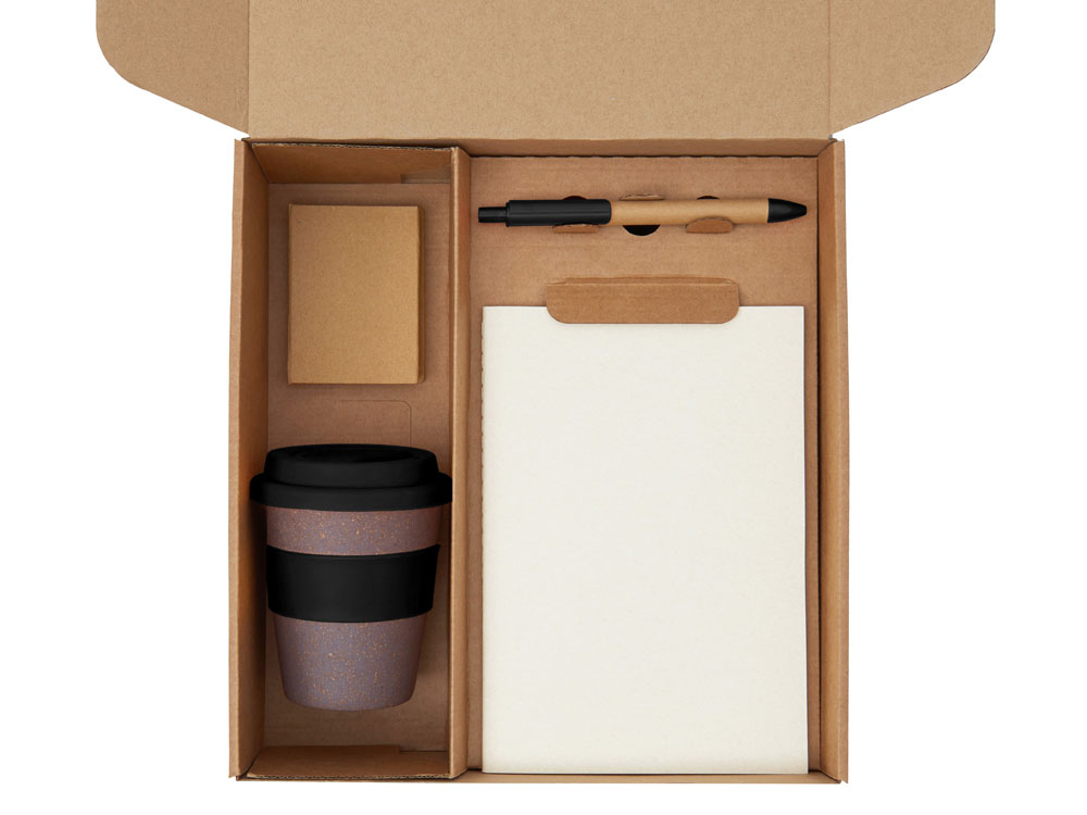 Материал: блокнот- бумага из переработанных тетра-паков, ручка- картон,пластик, стакан- 50% бамбуковое волокно, 50% полипропилен, коробка- картон