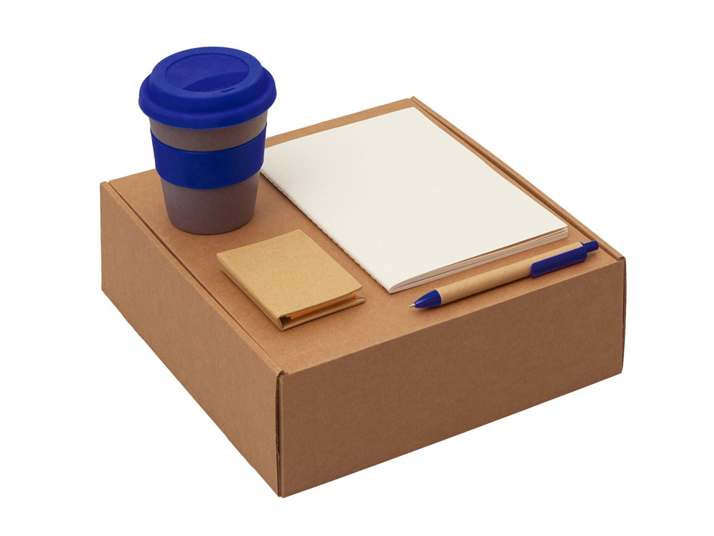 Материал: блокнот- бумага из переработанных тетра-паков, ручка- картон, пластик, стакан- 50% бамбуковое волокно, 50% полипропилен, коробка- картон