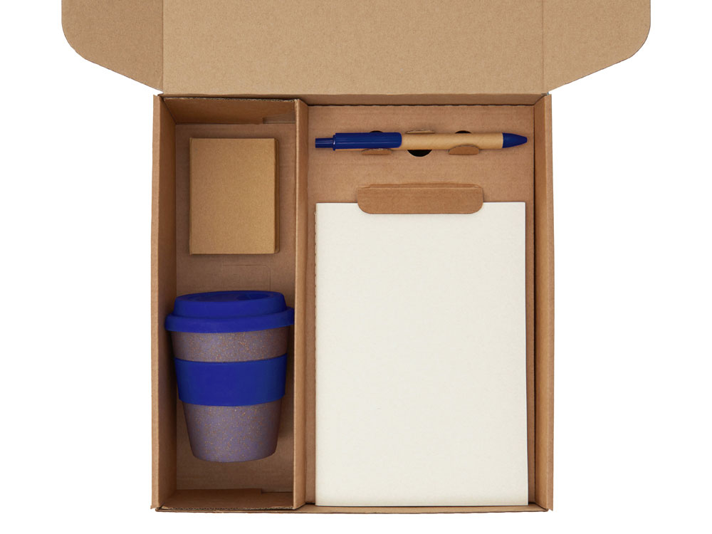 Материал: блокнот- бумага из переработанных тетра-паков, ручка- картон,пластик, стакан- 50% бамбуковое волокно, 50% полипропилен, коробка- картон