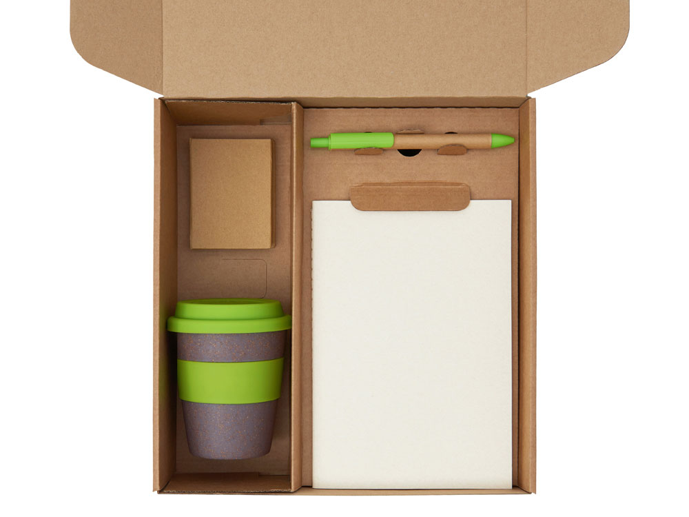 Материал: блокнот- бумага из переработанных тетра-паков, ручка- картон,пластик, стакан- 50% бамбуковое волокно, 50% полипропилен, коробка- картон