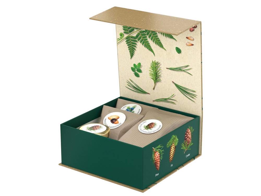 Аромат и вид хвои – символ Рождества и Нового года. Хвойная шкатулка С сосновым годом! оформлена праздничным паттерном и изображением шишек разных хвойных деревьев. На крышке шкатулки помещена иллюстрация, изображающая вид снизу вверх на звёздное небо и уходящие ввысь сосны. При надевании на шкатулку шубера (суперобложки) с круглым отверстием, на крышке шкатулки появляется вырубное изображение новогоднего шарика.