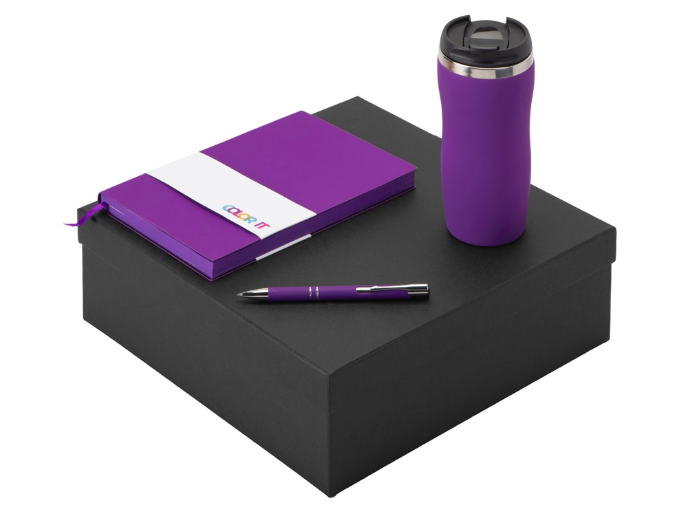 Подарочный набор с блокнотом С1, металлической ручкой и термокружкой, фиолетовый с логотипом компании - отличный способ заявить вашу корпоративную идентичность.