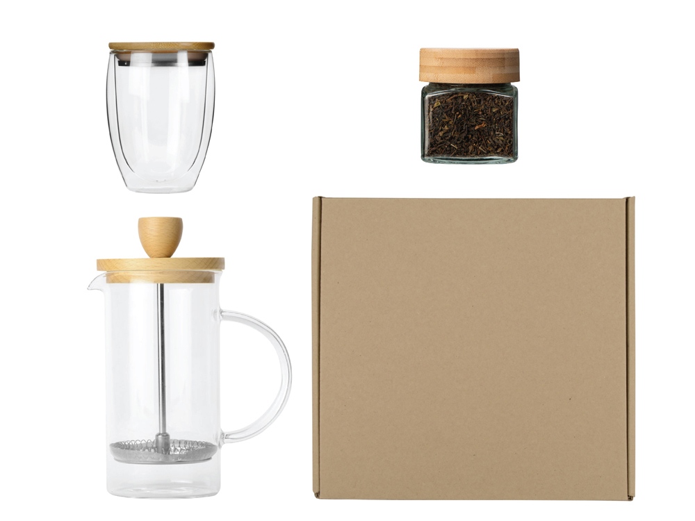 Подарочный набор с френчпрессом, стаканом и чаем с логотипом компании - отличный способ заявить вашу корпоративную идентичность.