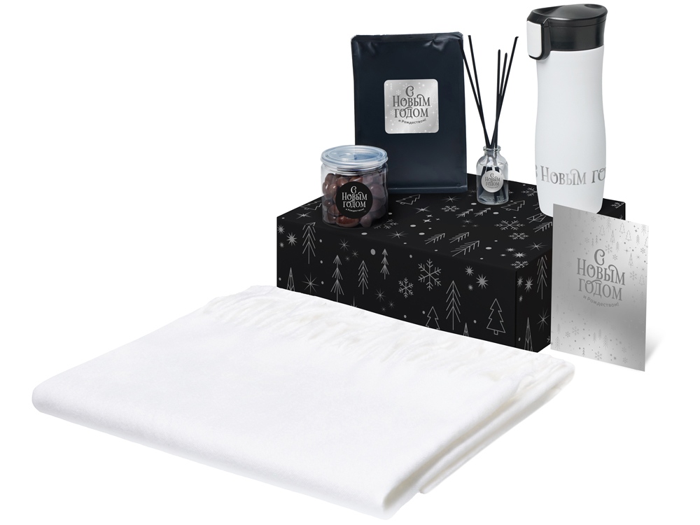 Материал: палантин - 100% полиэстер, термокружка - нержавеющая сталь, открытка - бумага, мешок - нетканый материал (спанбонд)