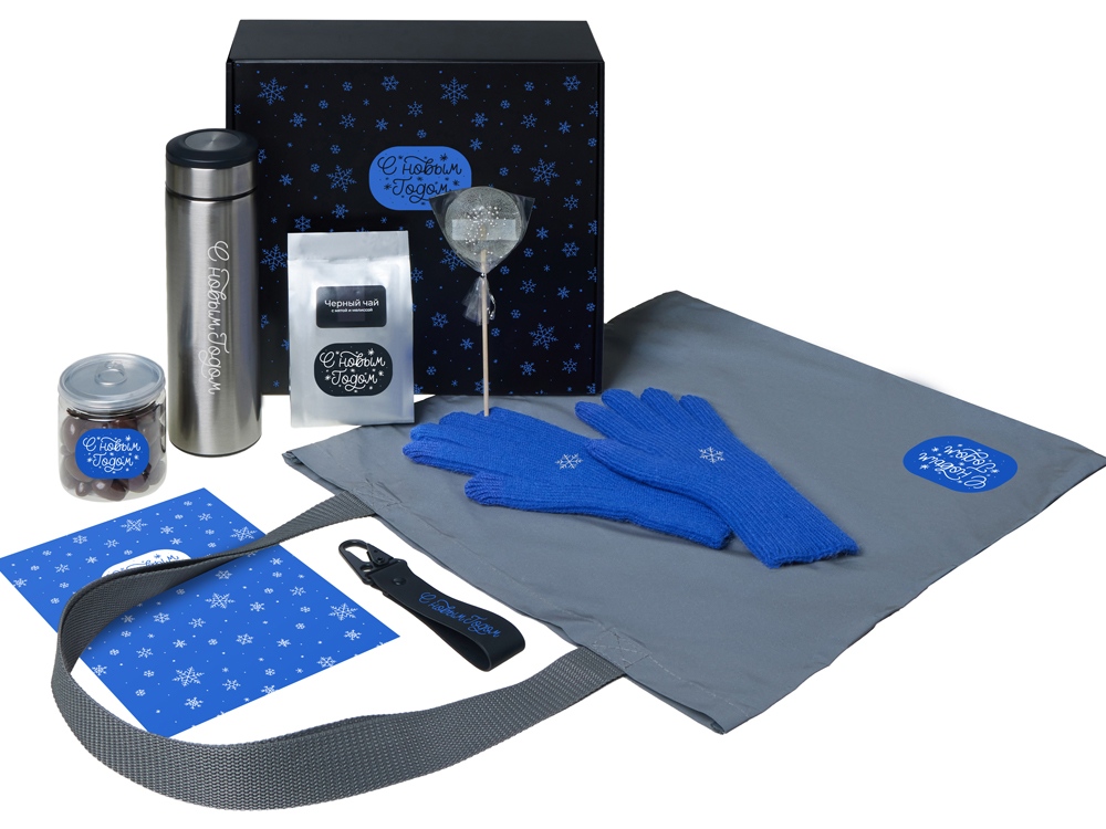 Подарочный набор с перчатками, термосом и чаем, синий с логотипом компании - отличный способ заявить вашу корпоративную идентичность.
