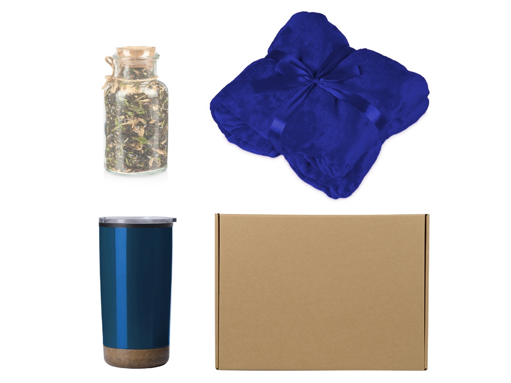 Подарочный набор с пледом, термокружкой и чаем, синий с логотипом компании - отличный способ заявить вашу корпоративную идентичность.