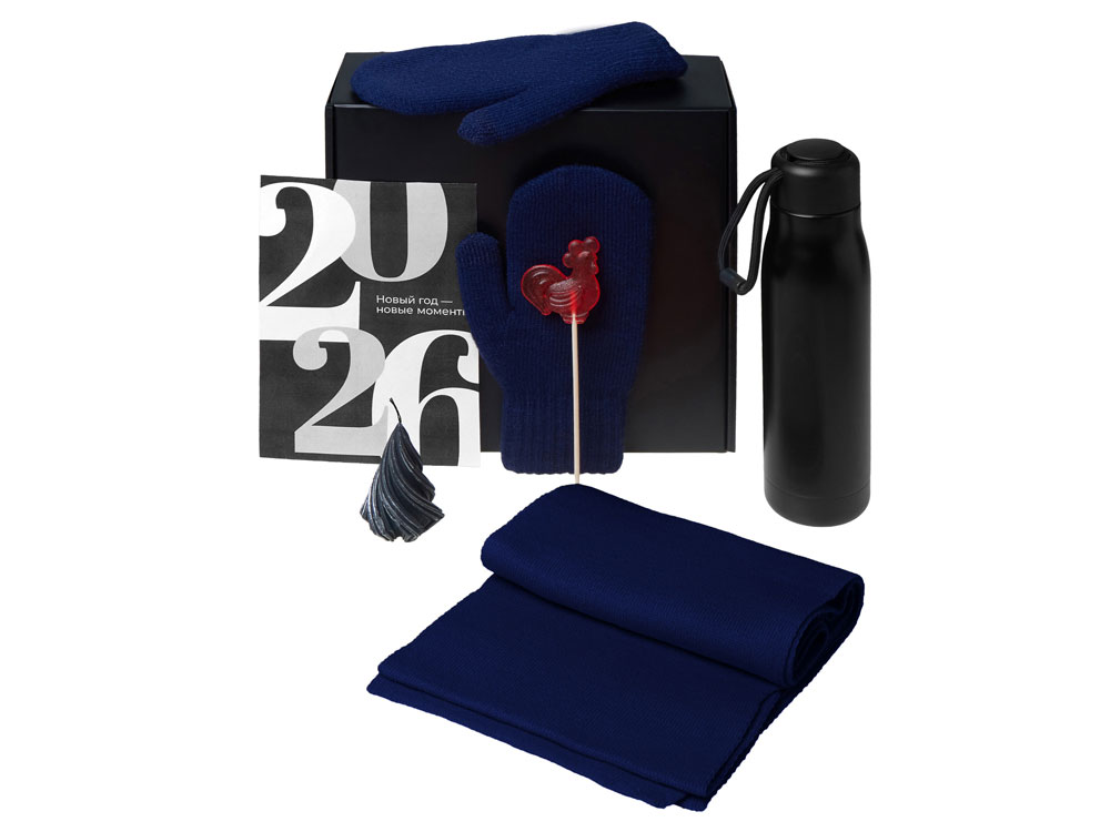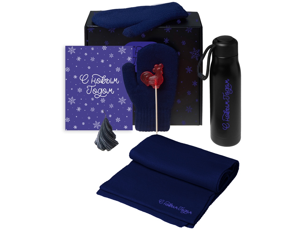 Подарочный набор с варежками, шарфом и термосом, темно-синий с логотипом компании - отличный способ заявить вашу корпоративную идентичность.