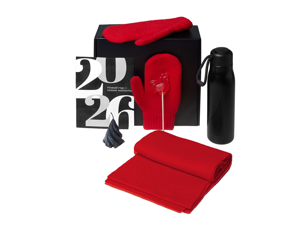 Подарочный набор с варежками, шарфом и термосом,красный с логотипом компании - отличный способ заявить вашу корпоративную идентичность.