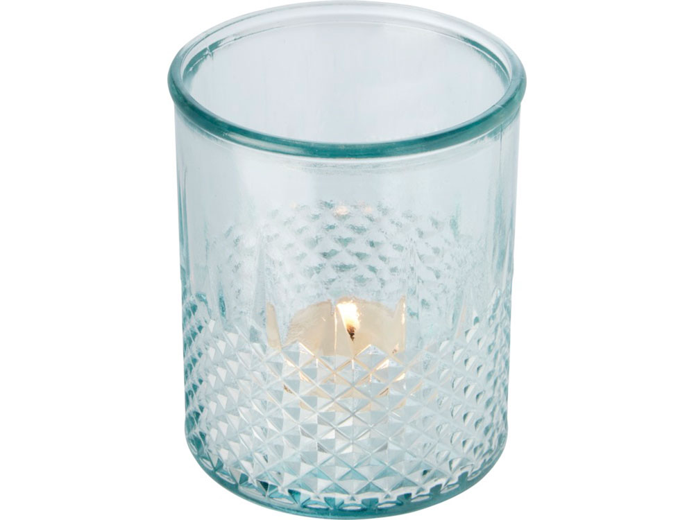 Подставка для чайной свечи из переработанного стекла Estrel, прозрачный с логотипом компании - отличный способ заявить вашу корпоративную идентичность.