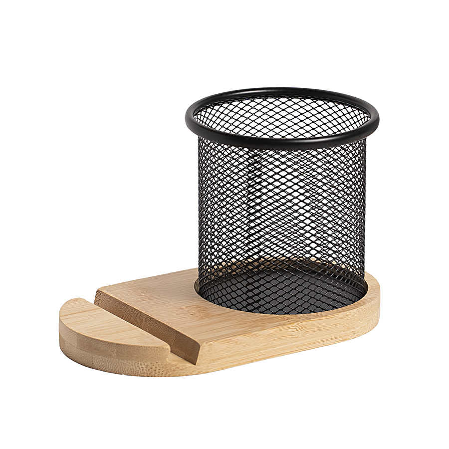 Как правило, на рабочем столе нам всегда не хватает места, т.к. каждый из однофункциональных предметов претендует на полезную площадь. Вашему вниманию предлагается дуэт, в котором объединены 2 функции. Это подставка для телефона из бамбука и металлический стакан-подставка под пишущие принадлежности. Комплект изготовлен из природных материалов. Позволяет организовать свое рабочее пространство стильно и компактно.