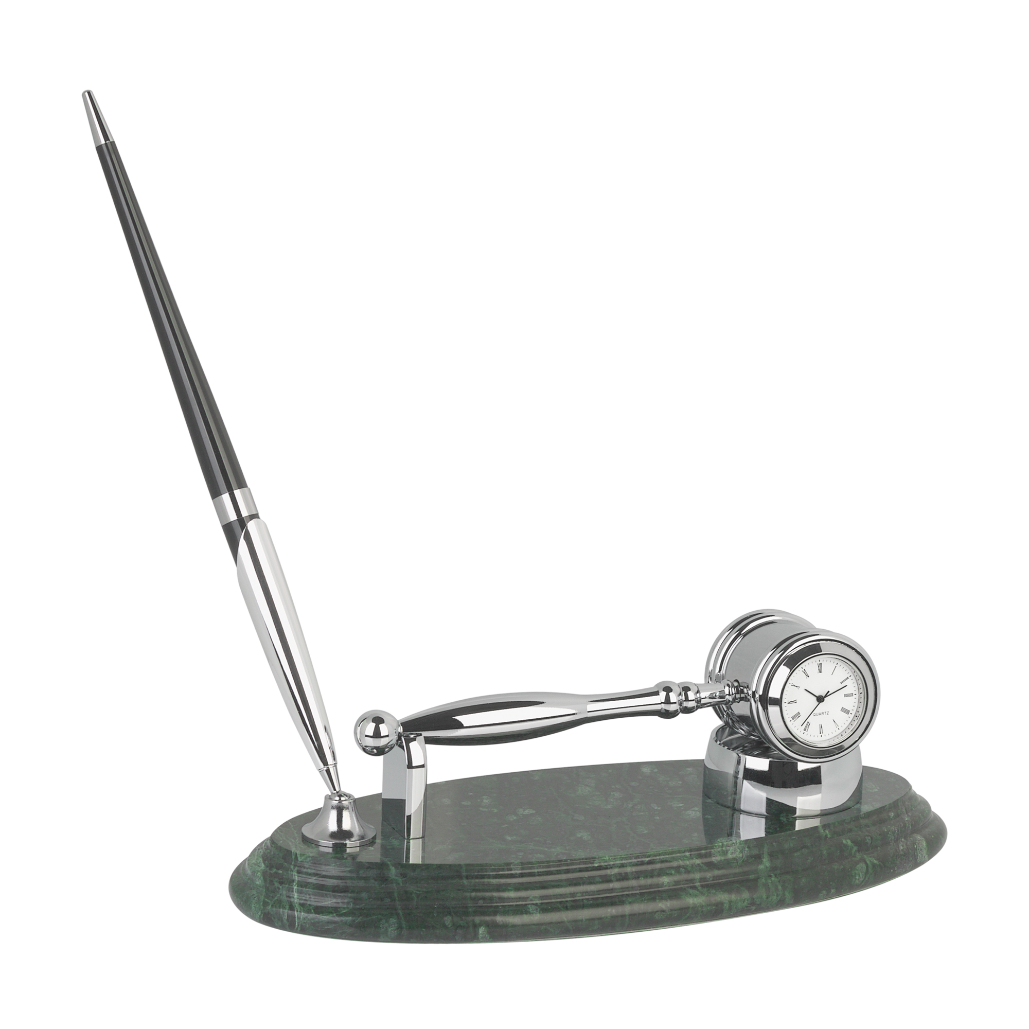 Подставка "Правосудие" с часами и ручкой с логотипом компании - отличный способ заявить вашу корпоративную идентичность.
